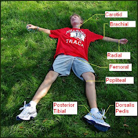Answer: temporal; facial; carotid; brachial; femoral; polliteal; posterior tibial; doralis pedis.
